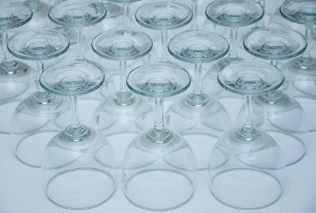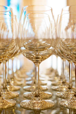 Row of glasses macro shot. Empty glasses on a banquet table close up