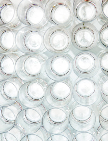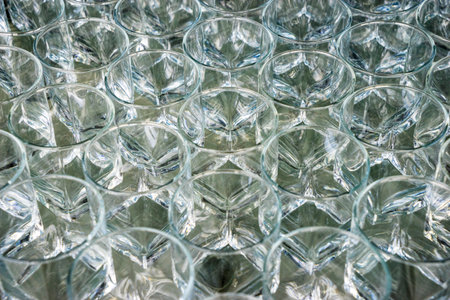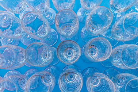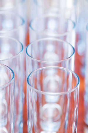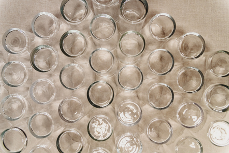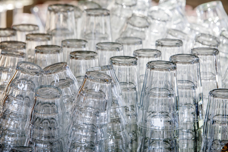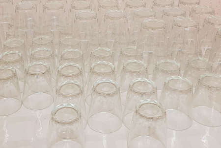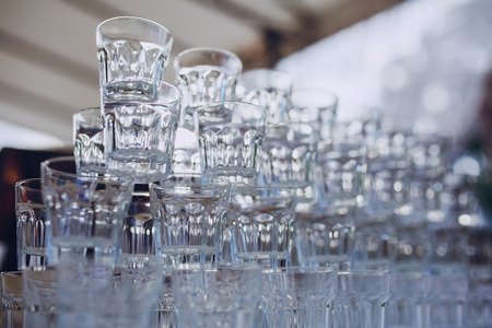 Many empty glasses in buffet restaurant, small glass water, glass background.