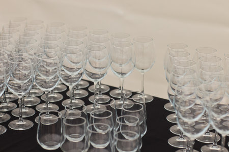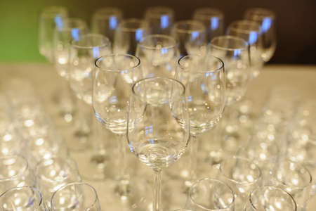 Clean glasses on a table prepared by the bartender for champagne and wine. Several of transparent glasses on a rack. Catering for the event preparation, clean glasses for drinks. Soft focus.