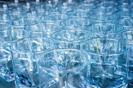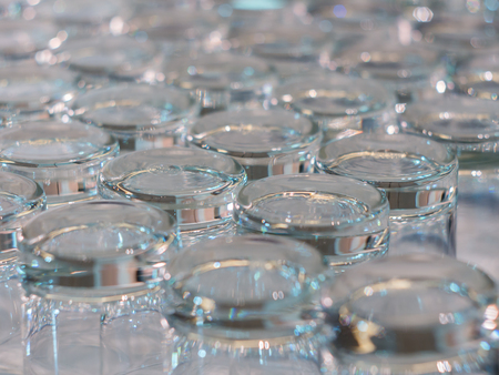 Abstract background of many empty glass of water placed on a table prepared for guests to dining in restaurant. Shallow depth of field in rows.