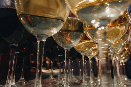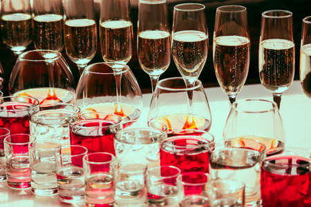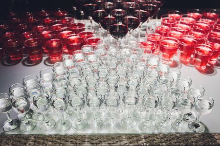 A lot of glasses with alcohol, cognac, whisky, party, celebration. Buffet with lots of glasses on event catering