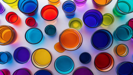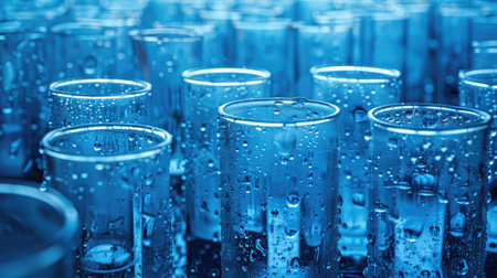 Array of blue glasses arranged with reflections and light effects, creating a futuristic, abstract aesthetic. Ideal for creative and design themes.