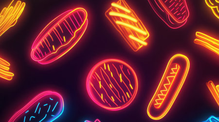 Bright neon designs of burgers, hot dogs, and fries create an eye-catching display, enhancing the atmosphere with lively colors.