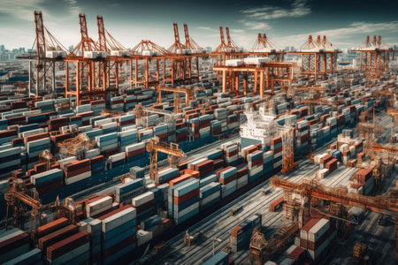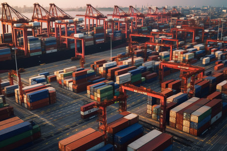 Industrial scene: containers, cranes and cargo being loaded., generative AI