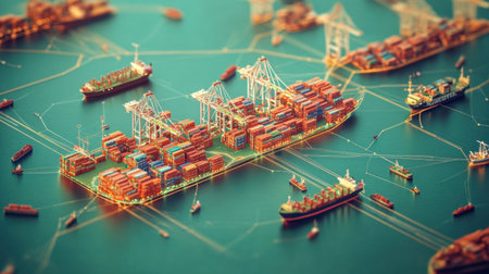 This intricate image depicts a miniature view of a bustling shipping port filled with colorful container ships and cargo cranes, showcasing maritime logistics.