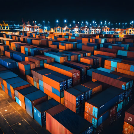 A bustling industrial port scene featuring large orange cranes and stacked shipping containers under a dramatic cloudy sky, highlighting maritime logistics.