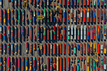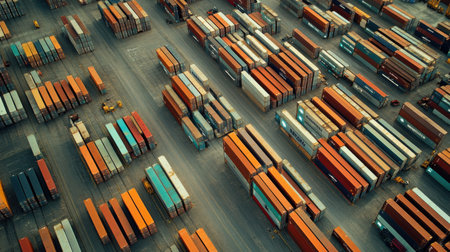 Aerial view of cargo containers arranged in rows at a busy shipping yard, symmetry and order