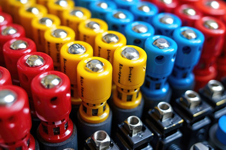Close-up of Colorful Cylindrical Objects with Silver Tops