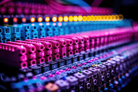 Closeup of colored computer network cables connected to a switch