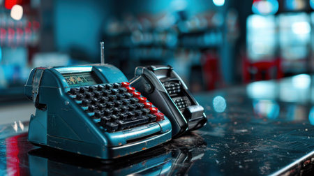A detailed view of vintage office equipment featuring a classic calculator and a retro telephone. The glossy table reflects the nostalgic charm of bygone technology.