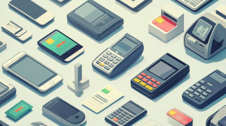 Multiple fintech solutions are displayed, highlighting digital wallets, payment terminals, and smartphones. This showcase exemplifies modern payment technologies used today.