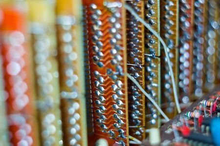 Vintage electronic circuit boards with radio parts and chips, close-up, macro photography
