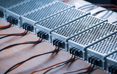 Metal mesh cases of power supply and wires are on a wooden table at the production of high-tech computers. Concept of high technology and industrial production