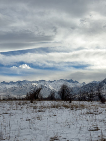 Snow covered mountains in Kyrgyzstan under cloudy winter sky peaceful rural landscape.