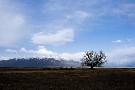 Arid plains against Sierra Nevada Mountains and blue sky with clouds