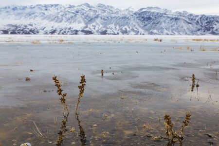 bartogai lake with transparent water with mountains in background in winter time near Almaty, Kazakhstan