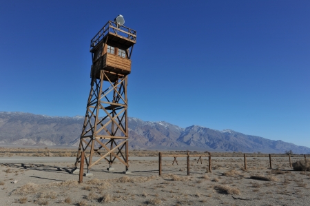 One of the guard towers at the Manzanar Detention Center in California where tens of thousands of people with Japanese ancestry were held during World War II