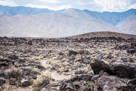 Young woman photographer explores Fossil Falls in California. Photo shows the scale of the vast open area