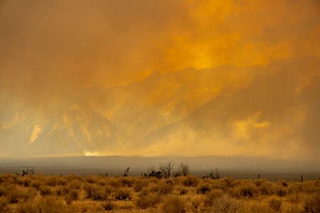 Ruins of the Manzanar National Historic Site Monument in Inyo County California. Nearby wildflire gives an orange smokey hue to the photo