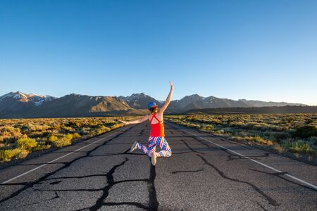 Adult female wearing patriotic American clothing jumps in the middle of a mountain road with her arms raised, concept for freedom. Photo taken in Mammoth Lakes, California, in the eastern sierra