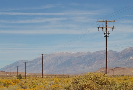 Power poles in the desert of the Eastern Sierras with blooming rabbitbrush on a sunny day with bright blue skies.