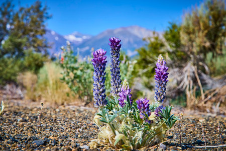 Purple Wildflower Bloom in Rocky California Landscape with Mountain Backdrop