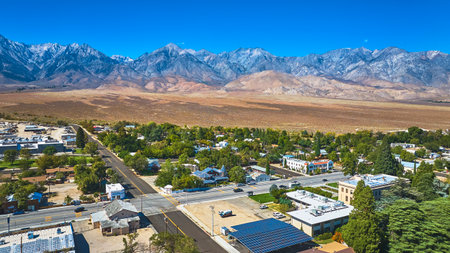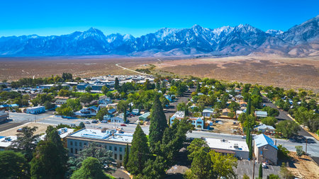 Aerial Independence California Small Town with Sierra Nevada Mountain Landscape