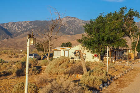 Olancha, USA - 06.06.2016: Main office building of Rustic Motel in California desert. Accomodation under blue sky on a hot summer day in California. Travel in the southwest.