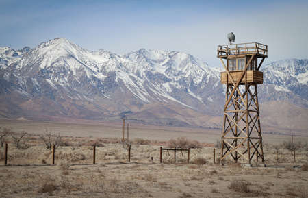 Manzanar, California - February 2020: A guard tower stands at along the edge of the former Manzanar internment camp with the Sierra Nevada mountains in the background.