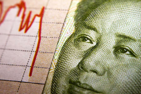 Stock Market Graph next to a Chinese Yuan banknote. Red trend line indicates the stock market recession period