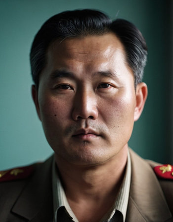 A middle-aged man from North Korea is depicted with a serious expression, dressed in formal attire, within an interior space that reflects the culture and environment of the region.