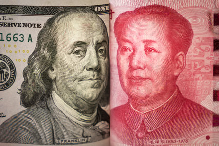banknotes of 100 American dollars and 100 Chinese yuan Renminbi, trade tension between China and the United States