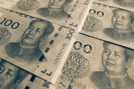 Official currency of China. Renminbi, abbreviation RMB. Yuan basic unit of the renminbi. Set of one hundred yuan close up. Chinese money. Business concept.