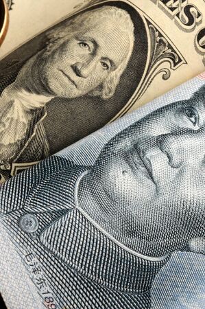 Chinese yuan money and torn US dollars, close-up. Dollar bills and yuan from China