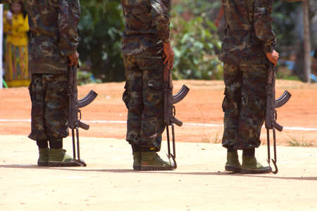 Military officers in formation with rifles during a ceremony. Honoring military service and discipline.