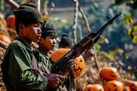 Two young soldiers stand guard in a pumpkin patch, holding rifles, with carved pumpkins scattered around them on a bright autumn day.