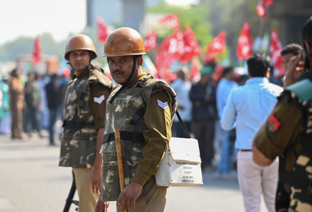 NOIDA INDIA DECEMBER 2 2024 Heavy police force deployed at Mahamaya flyover to stop farmers going to Delhi for protest on December 2 2024 in Noida India Led by the Samyukt Kisan Morcha Farmers from Uttar Pradesh staged a large protest at the Noida Delhi b