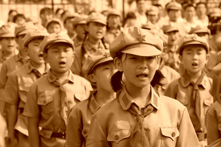 LUANNAN COUNTY - JULY 16: The Elementary student dressed in blue military uniform standing on the playground, on July 16, 2012, luannan county, Hebei province, China