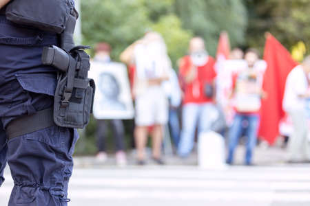 Krasnodar, Russia - August 10, 2019: Police stand in a cordon at an unsanctioned opposition rally. Suppression of rights and freedoms in Russia.