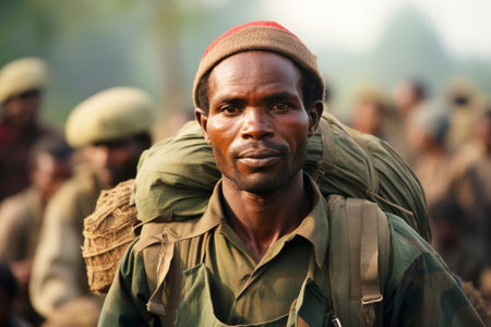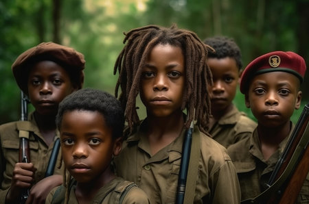 African children soldiers in military uniform. Group of little kids with combatant weapons. Generate ai