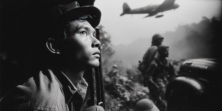 In a tense moment during the War in Malaya soldiers prepare for combat as an aircraft flies overhead. The scene captures the emotions and challenges faced by troops during the conflict.