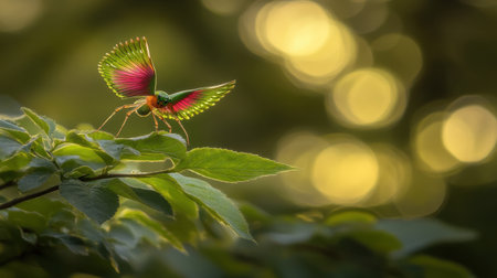 This enchanting image captures a vibrant butterfly perched on lush green leaves, surrounded by a soft bokeh background. The colorful wings showcase nature's exquisite beauty.