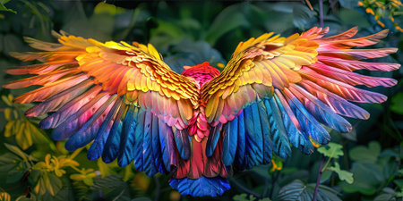 A close-up view captures the intricate details of a bird's wings, highlighting the rich textures and colors. The sunlight enhances the beauty of each feather, creating a mesmerizing scene.