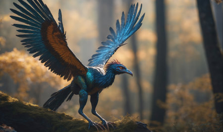 A large blue bird with orange and brown feathers perches on a branch in a forest, its wings spread wide as if about to take flight