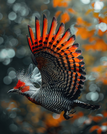 A stunning bird caught midflight, showcasing its vibrant feathers and expansive wings against a serene blue sky. Perfect for nature lovers and wildlife enthusiasts.