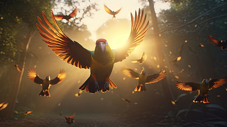 Witness the breathtaking beauty of a large group of parrots gracefully soaring through the Amazon rainforest at sunset, as sunbeams pierce through the foliage. A truly mystical experience that will leave you in awe.