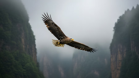 A majestic eagle soars through the air with wings fully spread against a backdrop of foggy mountain cliffs. The dramatic landscape features steep, green-covered rock formations shrouded in mist.
