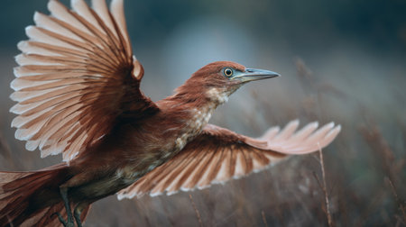 A striking rust-colored bird takes flight in a hazy, tranquil environment. The detailed feathers and graceful wing span capture the essence of wildlife in motion.