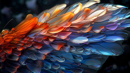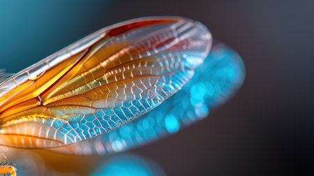 This stunning close-up photograph captures the intricate patterns and vibrant colors of an insect wing, showcasing its transparent textures and stunning details.