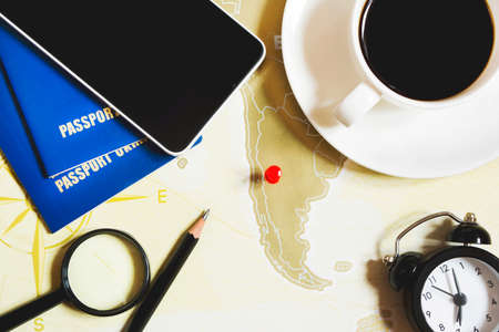 journey and release. Top view of a table in the airport lounge, passports, a cup of coffee, a camera and a map. vacation concept, airplane flight. Flatlay.